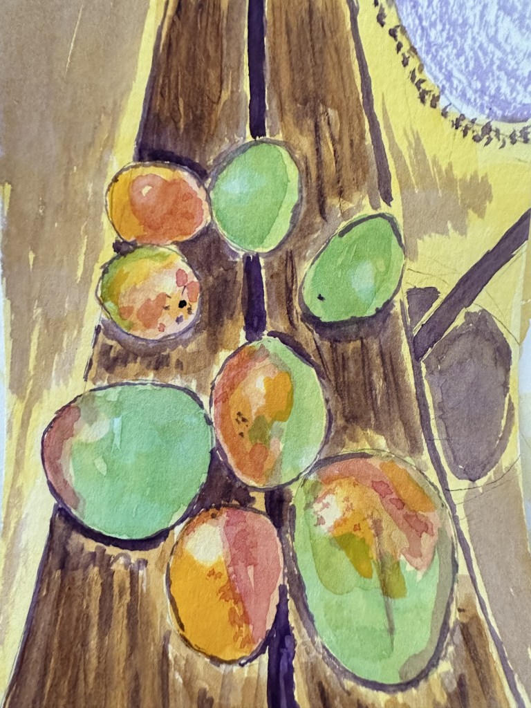 July 14, 2023July 14, 2023 mangoes on a picnic bench in my sister’s yard in allapattah, miami Mangoes Watercolor on 5″ x 8″ paper, James Ernest Malphurs, 2023 Share this: Share on X (Opens in new window) X Share on Facebook (Opens in new window) Facebook Like Loading...