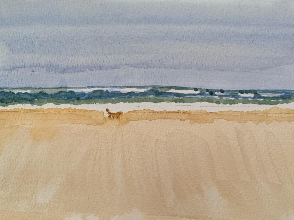 July 14, 2023August 20, 2023 Roxie on Oregon Beach Roxie on the beach in Clatsop County, OR Watercolor on 5″ x 8″ paper, James Ernest Malphurs, 2023 Share this: Share on X (Opens in new window) X Share on Facebook (Opens in new window) Facebook Like Loading...